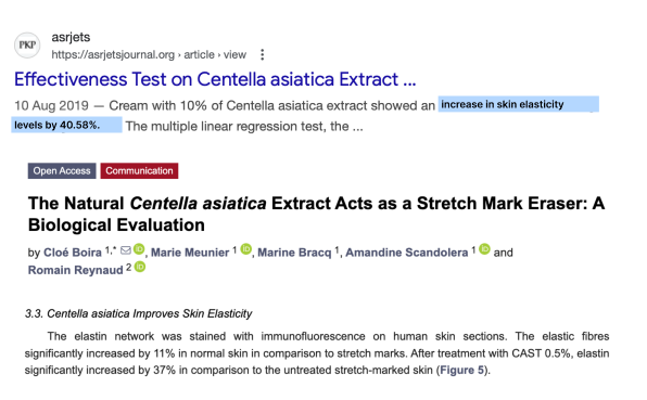 That’s because these elastin fibers or “rubber bands” are located deep in the dermis layer of the skin, and centella asiatica alone cannot penetrate deep enough into the skin to reach them.
